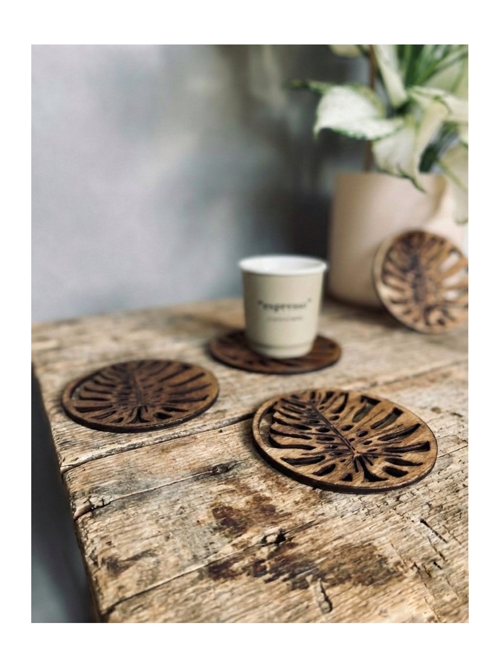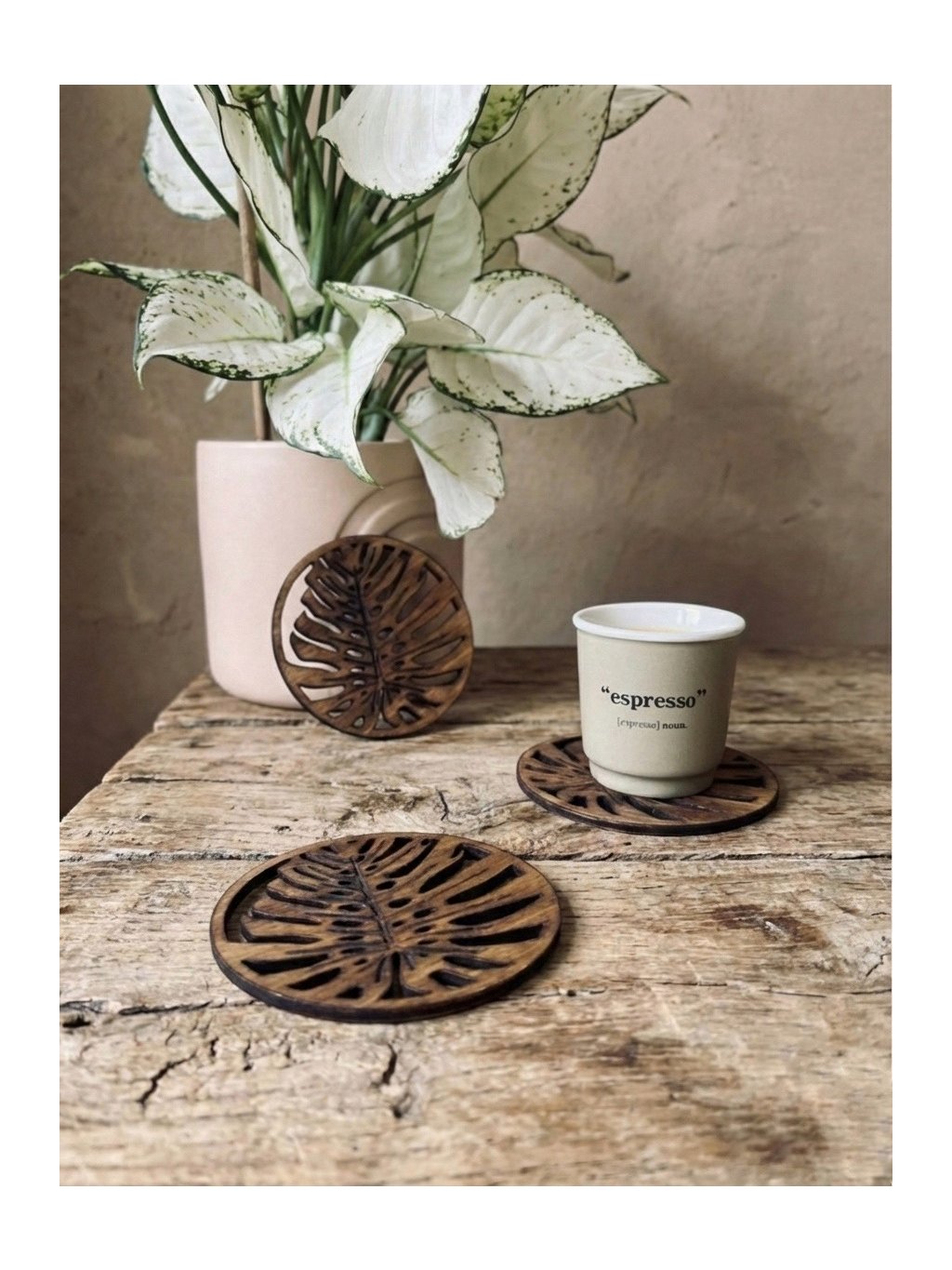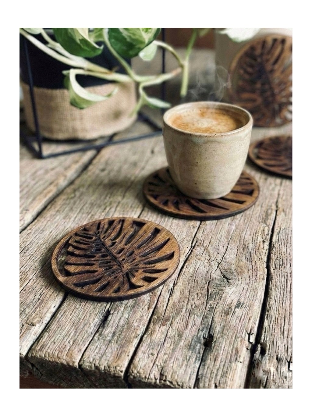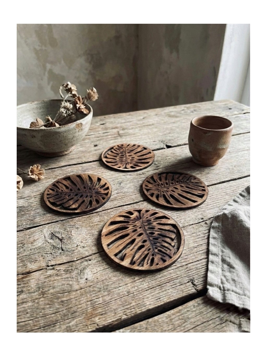 Dopřej svému stolování nádech přírody! Tyto dřevěné podložky pod sklenice, šálky a poháry (nebo podpivníky nebo podtácky) jsou inspirovány elegantním tvarem listů monstery.