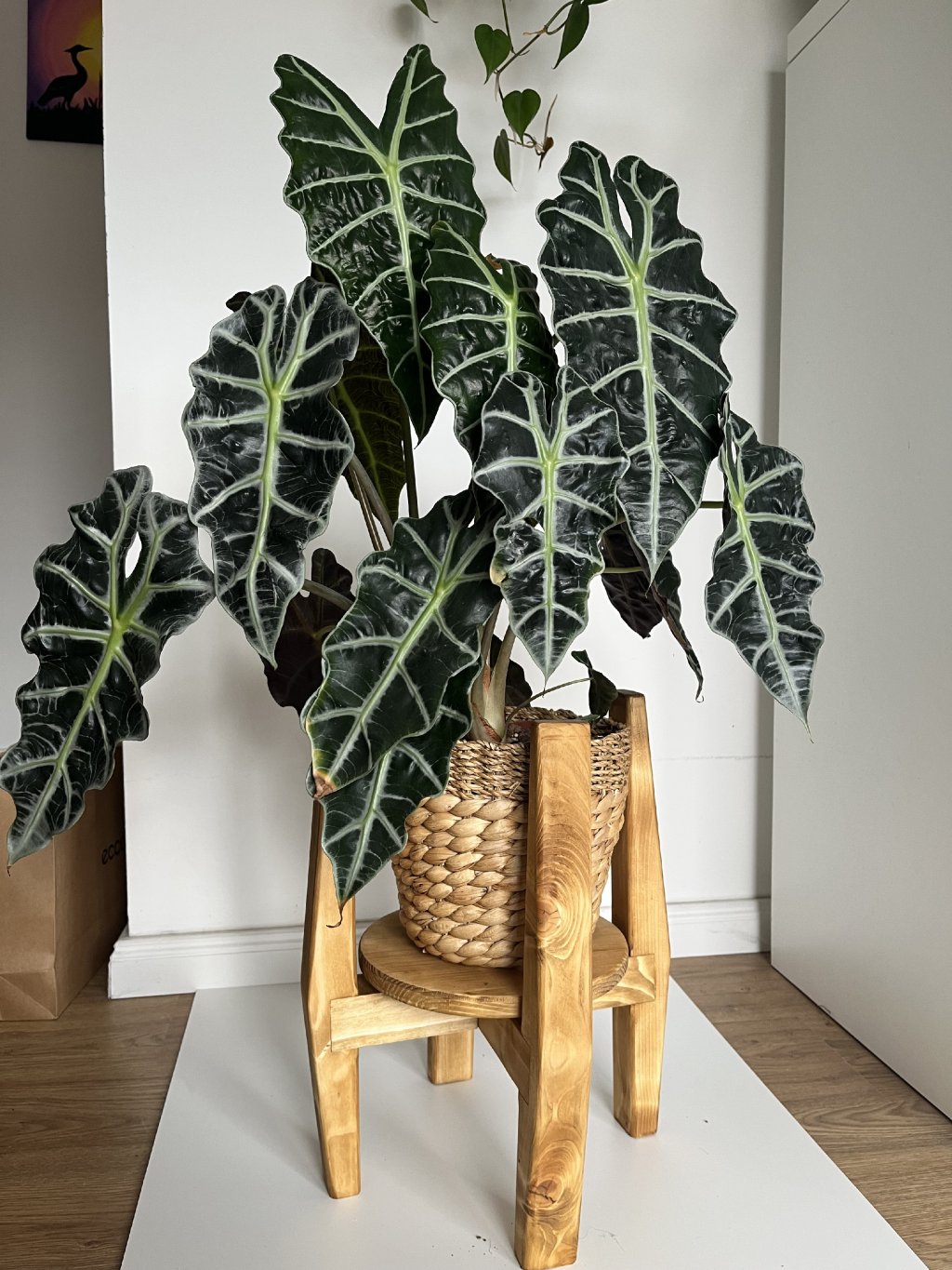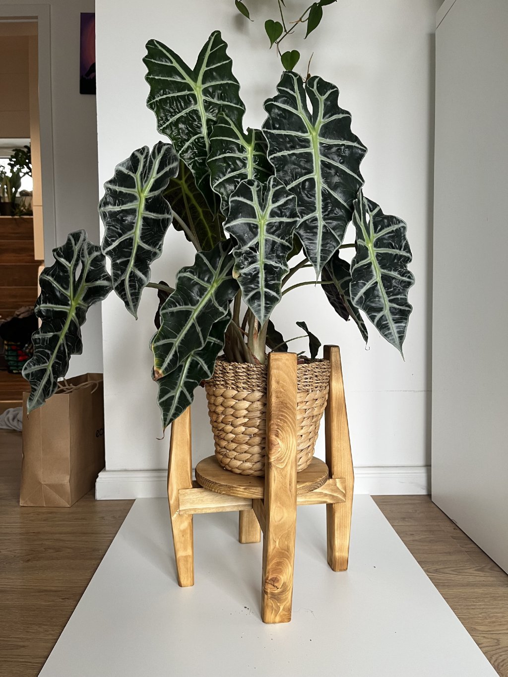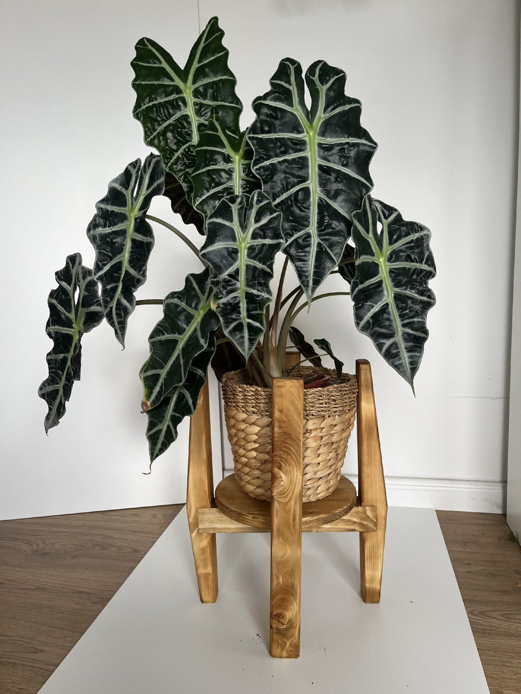 Introducing a rotating plant stand designed for all lovers of indoor greenery. This wooden plant stand solves a common problem: your plant's leaves, such as a Monstera or Alocasia, constantly reaching for a single light source, leading to one-sided and uneven growth.