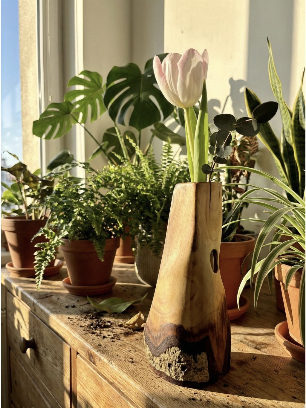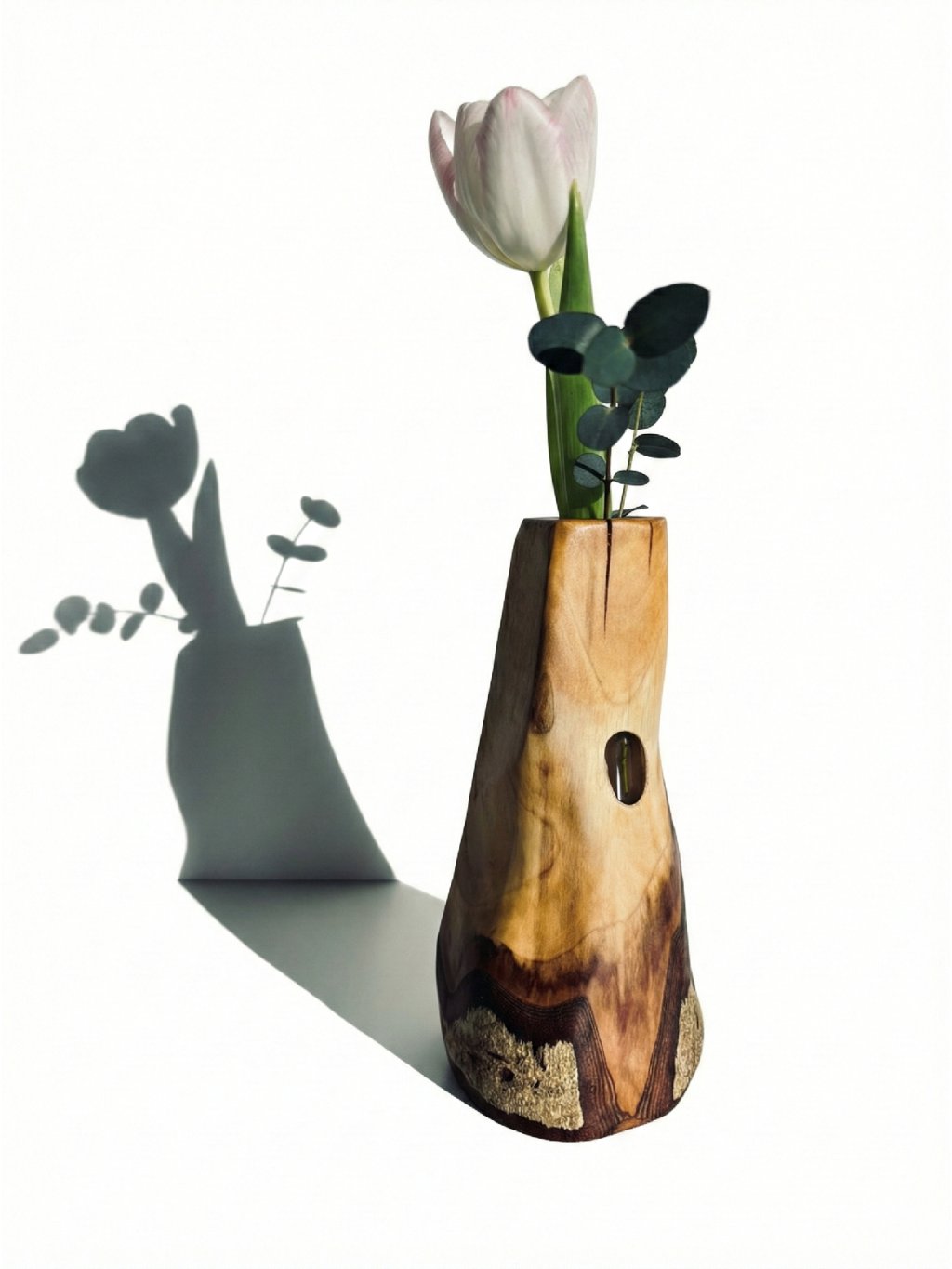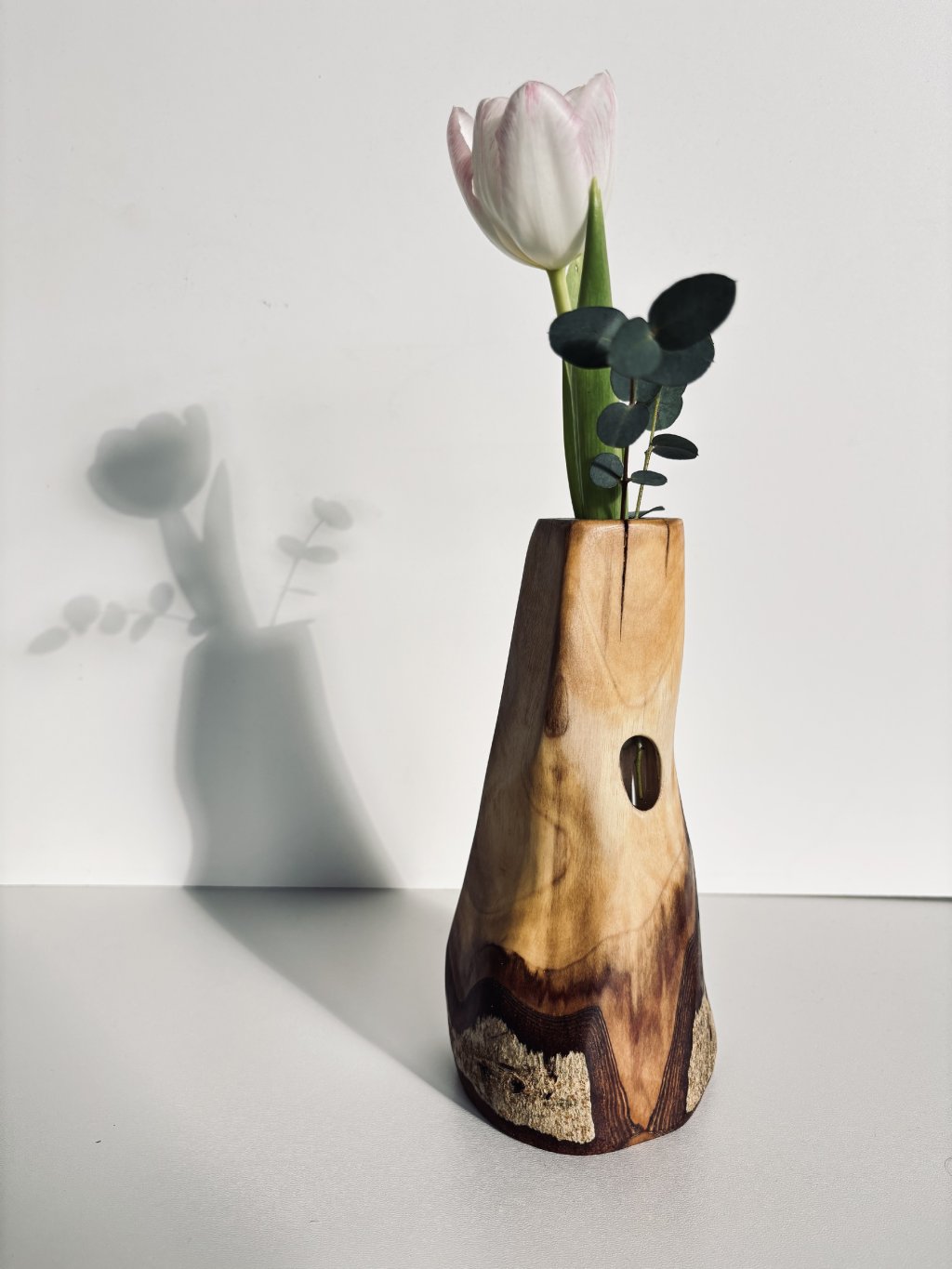 The vase includes a glass test tube, allowing for the safe arrangement of fresh flowers or fresh leaves. AVEUM is a perfect handcrafted piece that brings calm and the warm atmosphere of wood into your home.