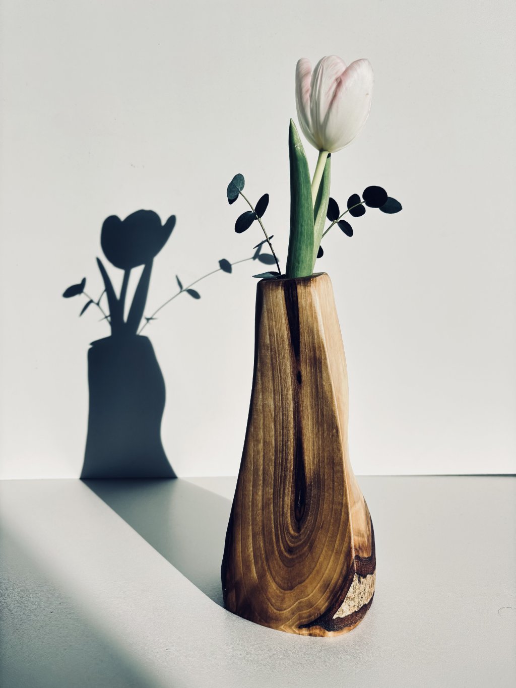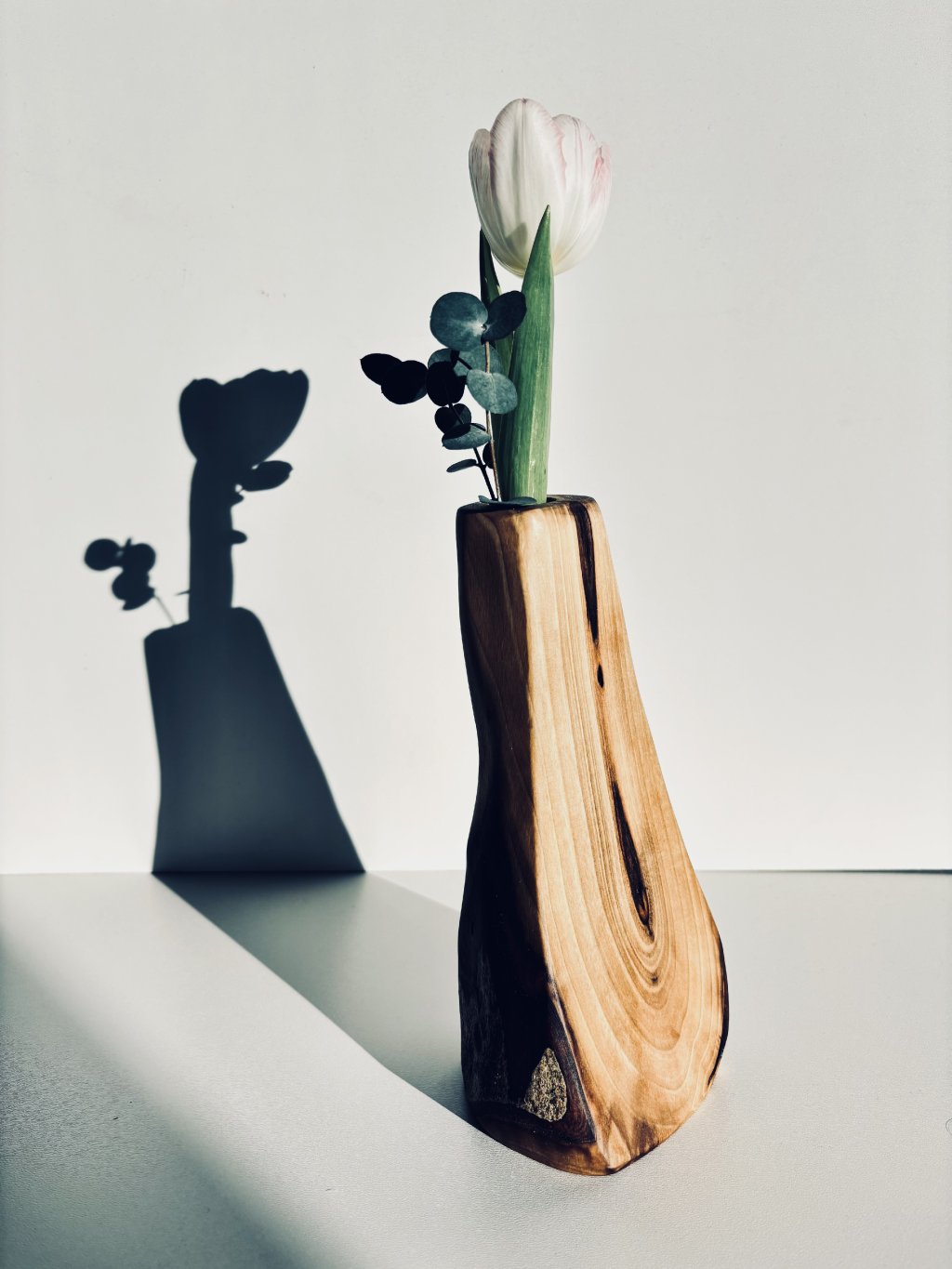 Walnut wood stands out with its dark, rich color and striking grain. The surface of the vase is hand-sanded and treated with premium natural oil, which highlights the authenticity of the material.