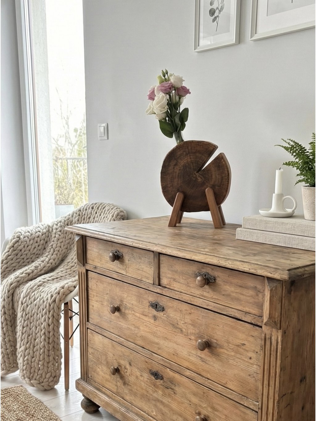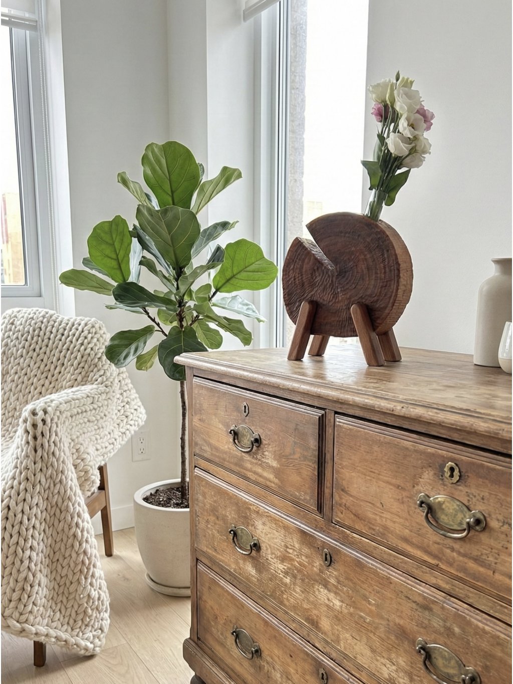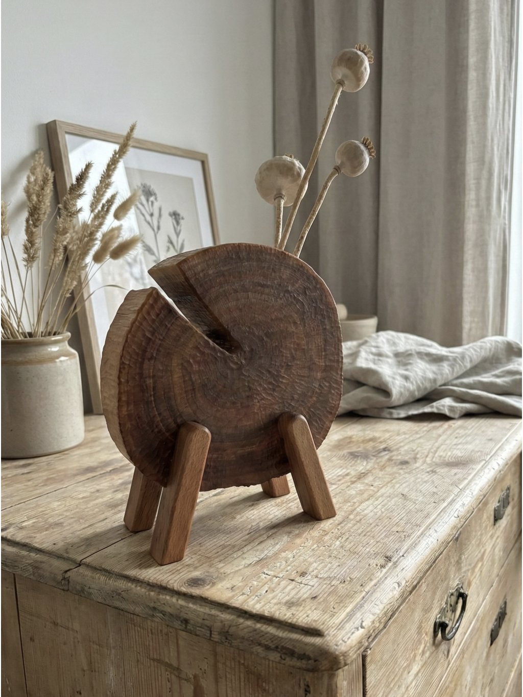 The wooden vase PLUMMA combines the dark depth of plum wood with the light spring of beechwood legs. This playful yet elegant design highlights the beauty of natural materials in a unique realization.