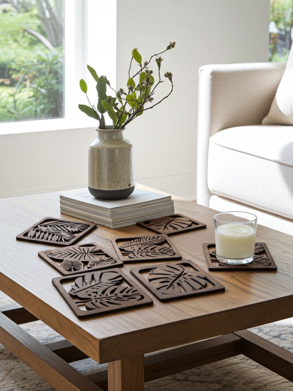 Štýlové drevené podložky pod šálky s motívom tropických listov. Balenie 6 ks pre milovníkov prírody a rastlín.
