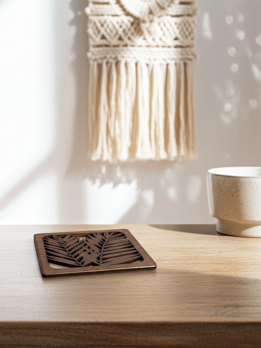 Prines do svojho domova kúsok tropického raja s týmito drevenými podložkami pod šálky a poháre s jemnými motívmi tropických listov ako monstera, palma či banánovník. Každý kus má unikátny vzor, ktorý dodá tvojmu stolovaniu štýl a prírodnú eleganciu.