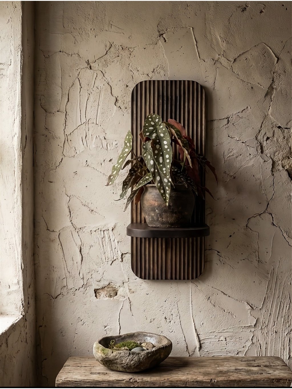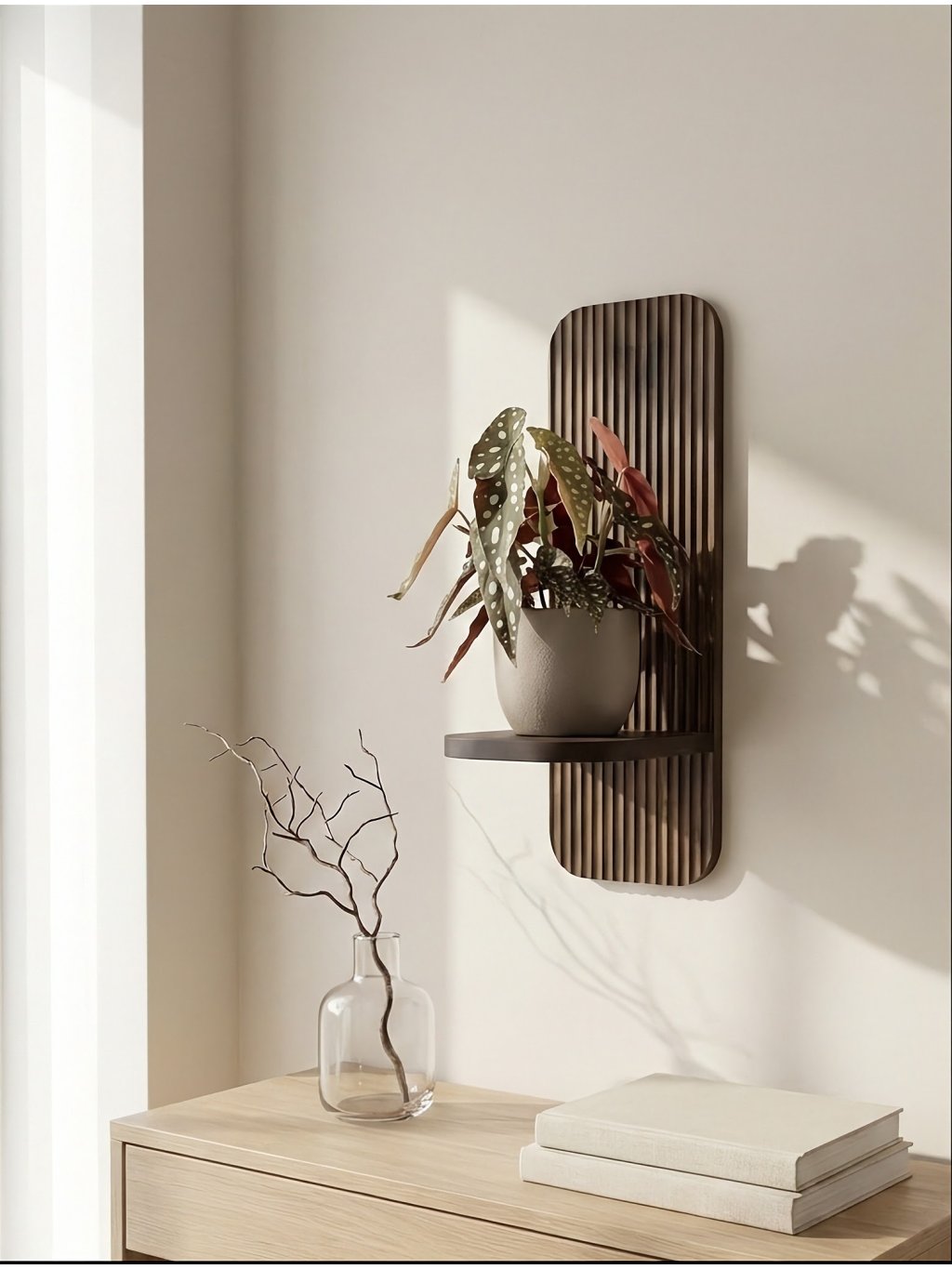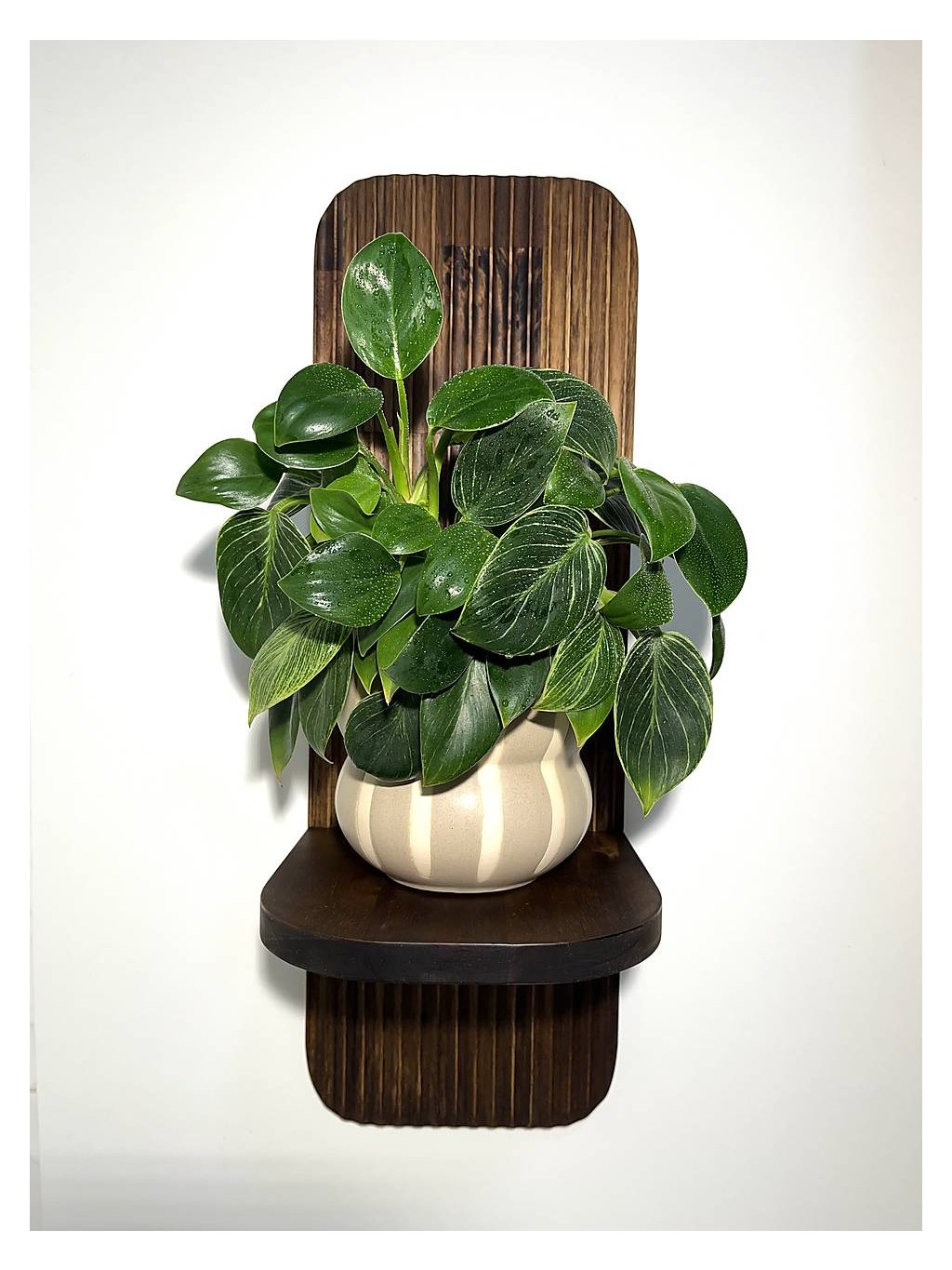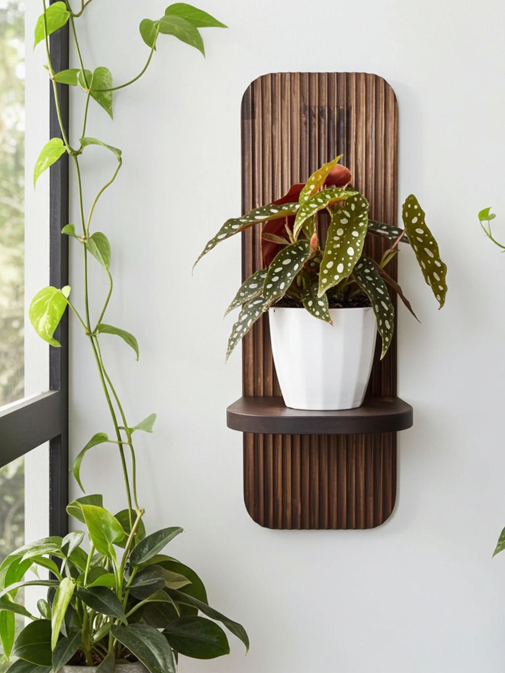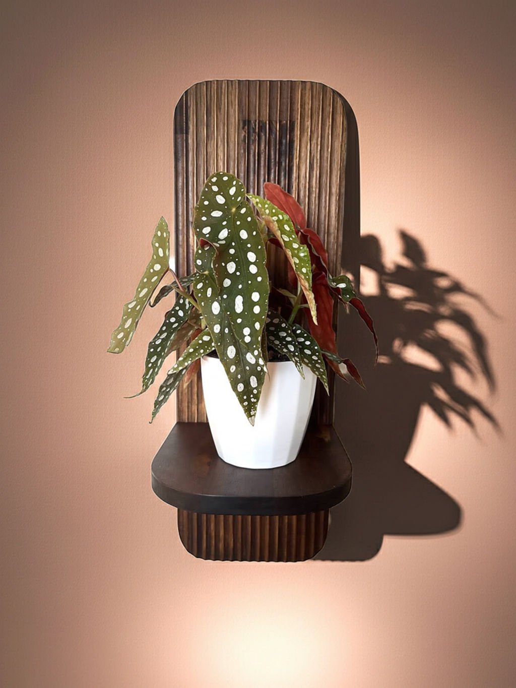 Drevený nástenný držiak na kvetináč z akáciového dreva – ručne vyrobený dizajnový doplnok do interiéru