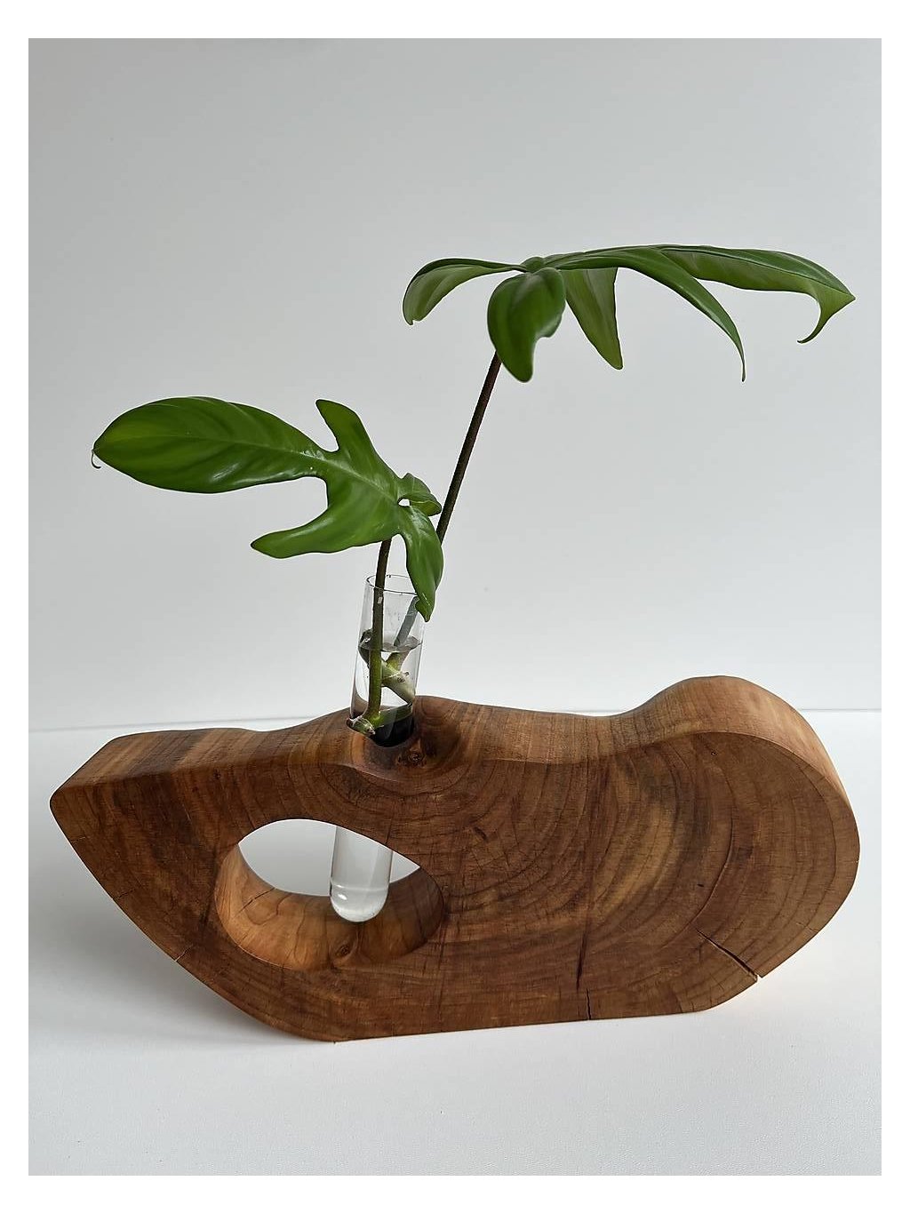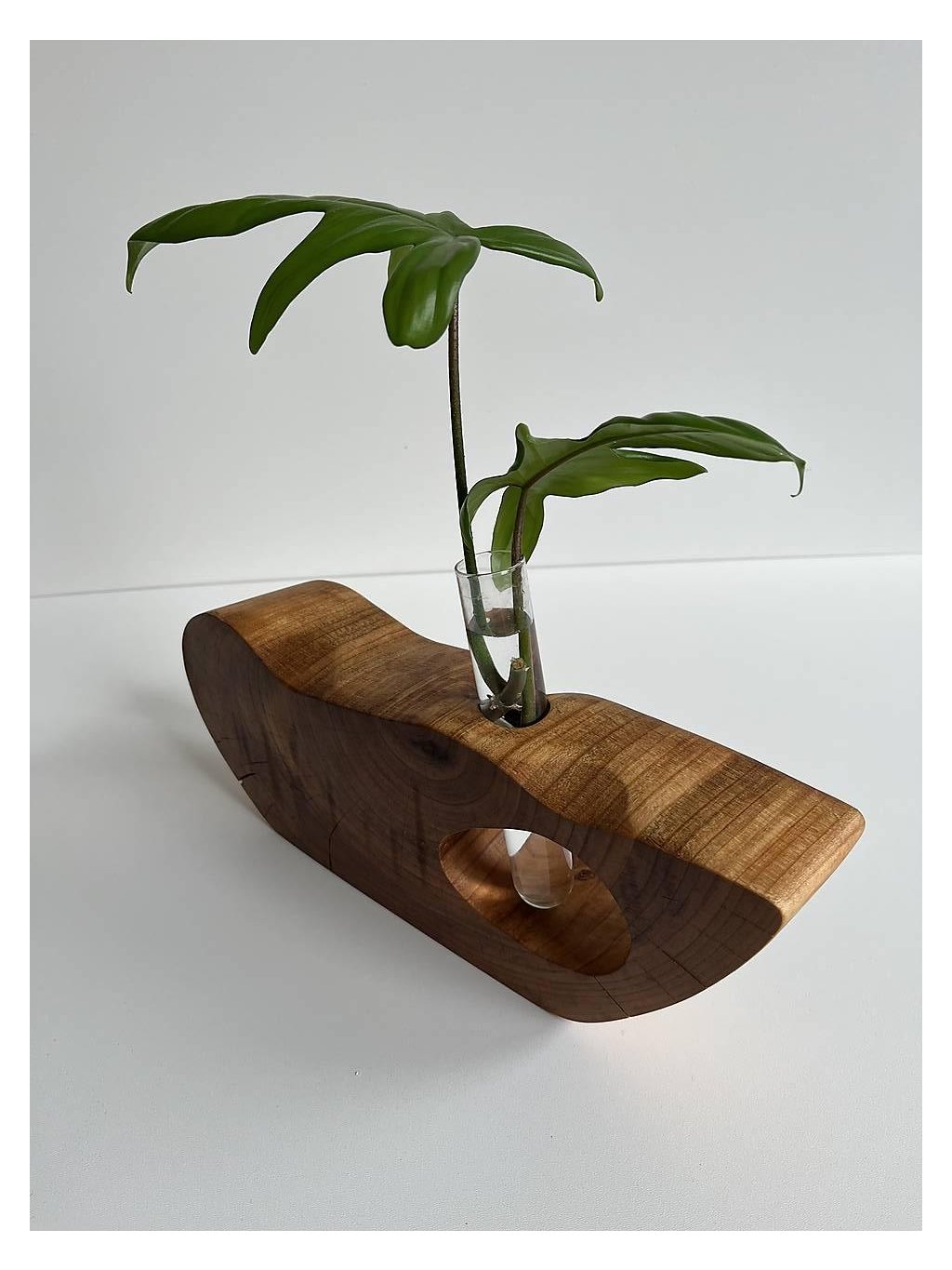 K váze dodávame sklenenú skúmavku, ktorá sa jednoducho vloží do otvoru. Tým pádom môžete túto organickú vázu využiť aj na drobné živé kvety, konáriky alebo na jednoduché aranžmány s vodou bez obáv o poškodenie dreva.