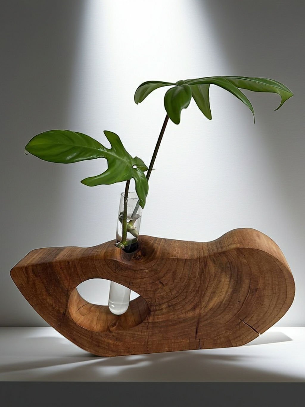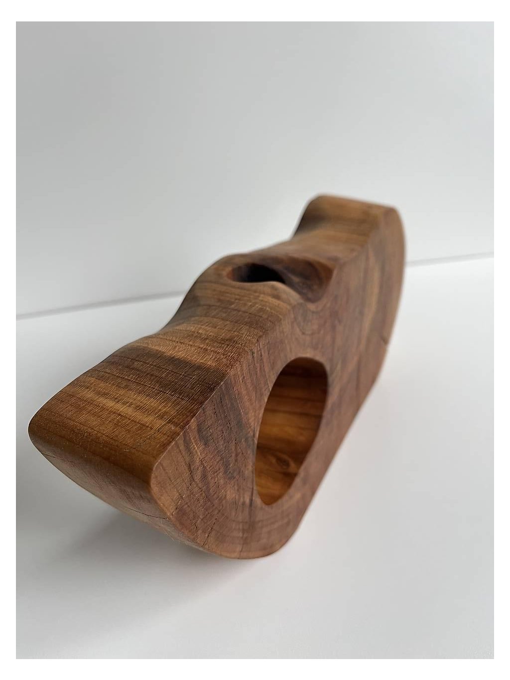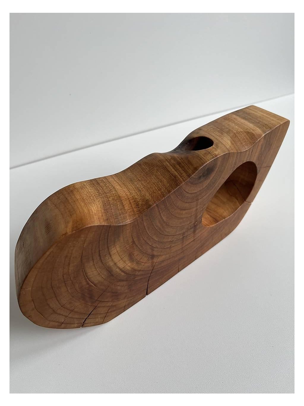 Je to ručne vyrezávaná váza z jedného kusa dreva, čo zaručuje jej vysokú kvalitu a jedinečnosť. Hladké krivky a zaoblené hrany sú doplnené efektným otvorom v strede, ktorý pridáva na jej modernom a umeleckom vzhľade. Nejde len o vázu – je to handmade umelecké dielo a bytový doplnok, ktorý okamžite pritiahne pozornosť.