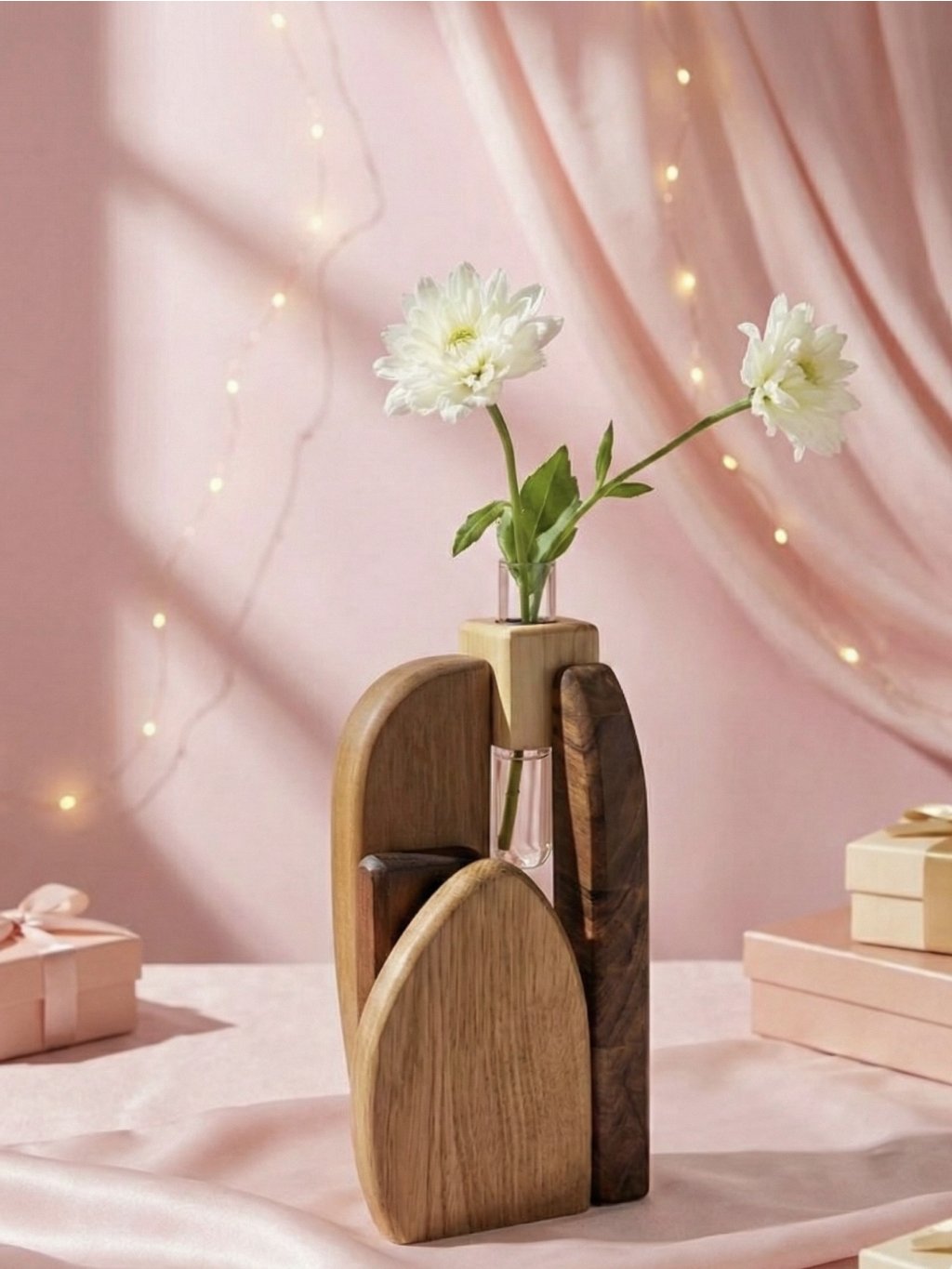 Je to ručne vyrobená váza z troch druhov slovenského dreva (orechové, jaseňové, dubové), čo zaručuje jej vysokú kvalitu a jedinečnosť. Nejde len o vázu – je to handmade umelecké dielo a bytový doplnok, ktorý okamžite pritiahne pozornosť.