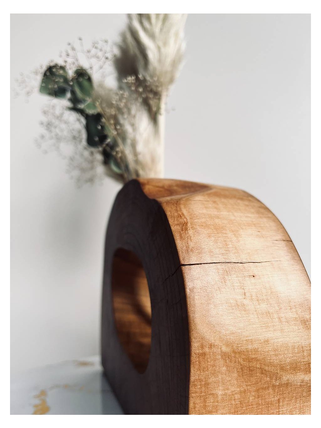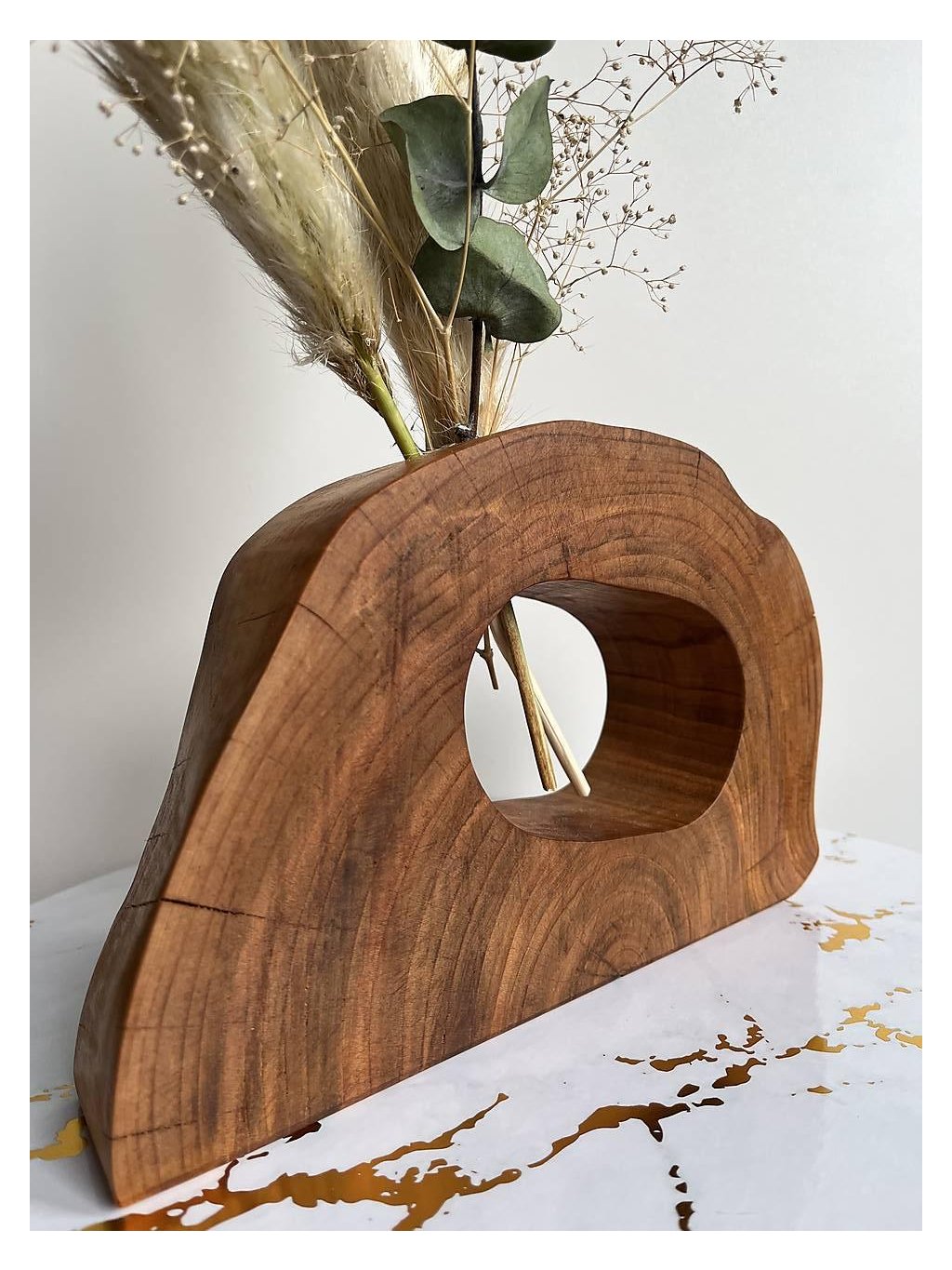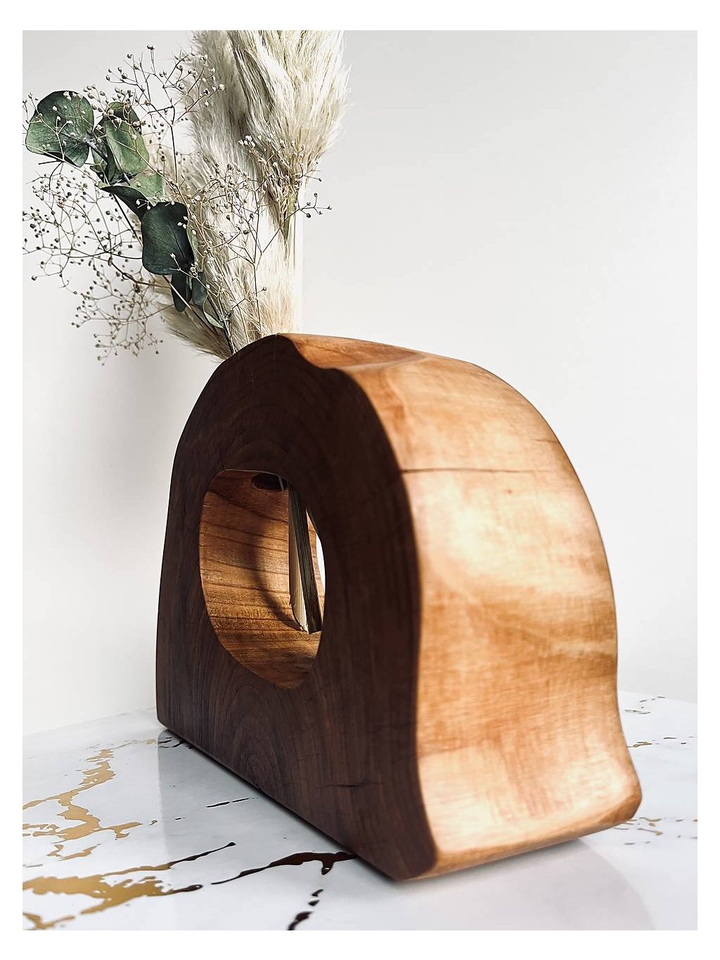 Je to ručne vyrezávaná váza z jedného kusa dreva, čo zaručuje jej vysokú kvalitu a jedinečnosť. Hladké krivky a zaoblené hrany sú doplnené efektným otvorom v strede, ktorý pridáva na jej modernom a umeleckom vzhľade. Nejde len o vázu – je to handmade umelecké dielo a bytový doplnok, ktorý okamžite pritiahne pozornosť.