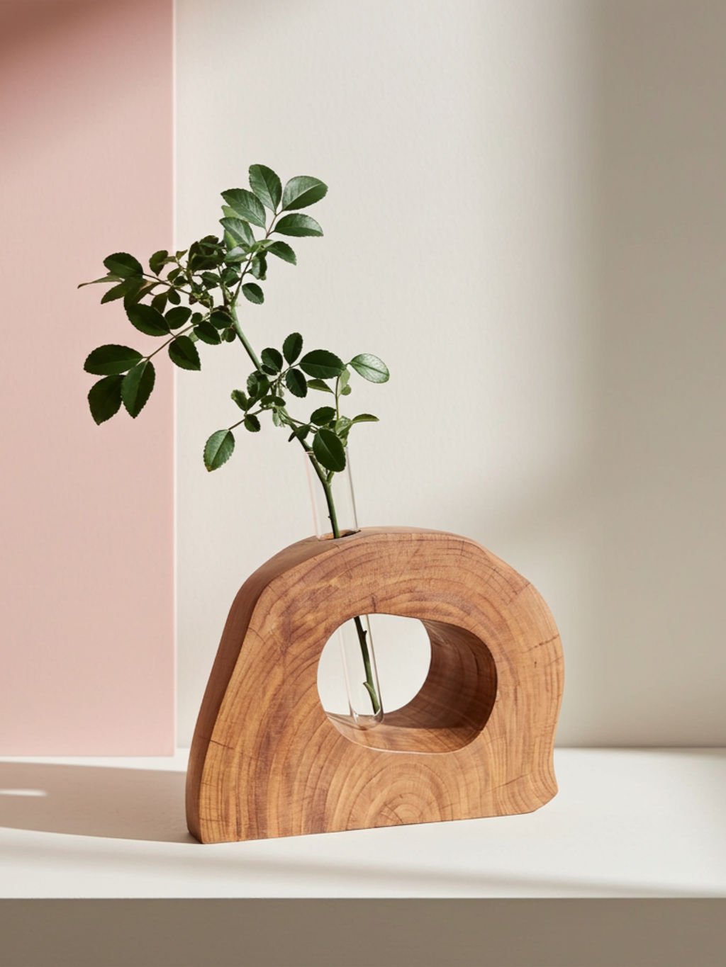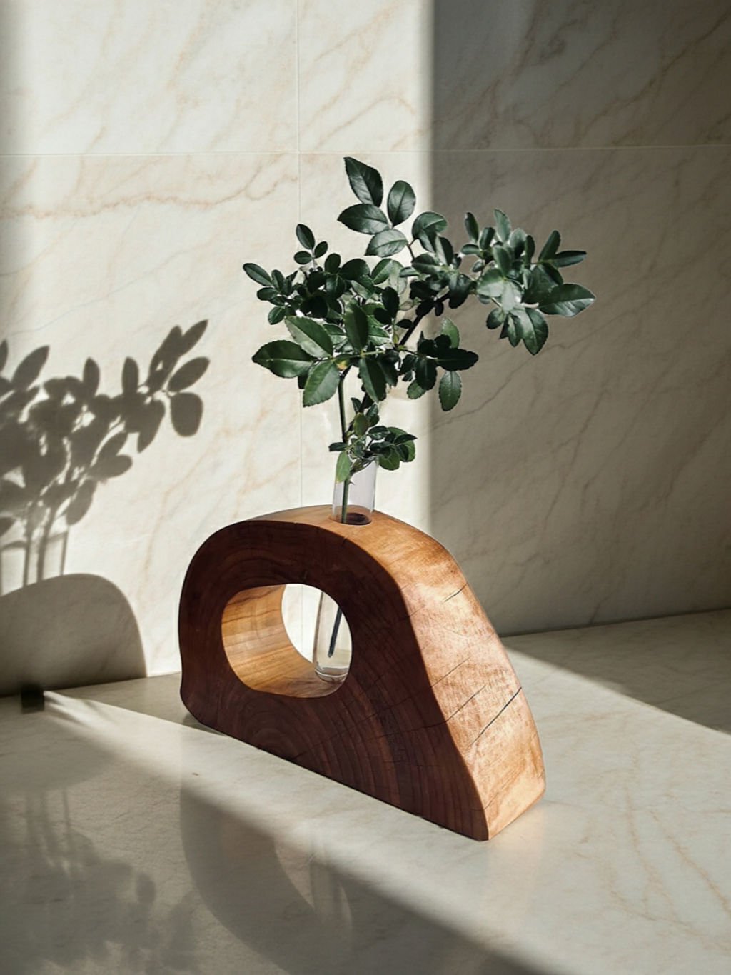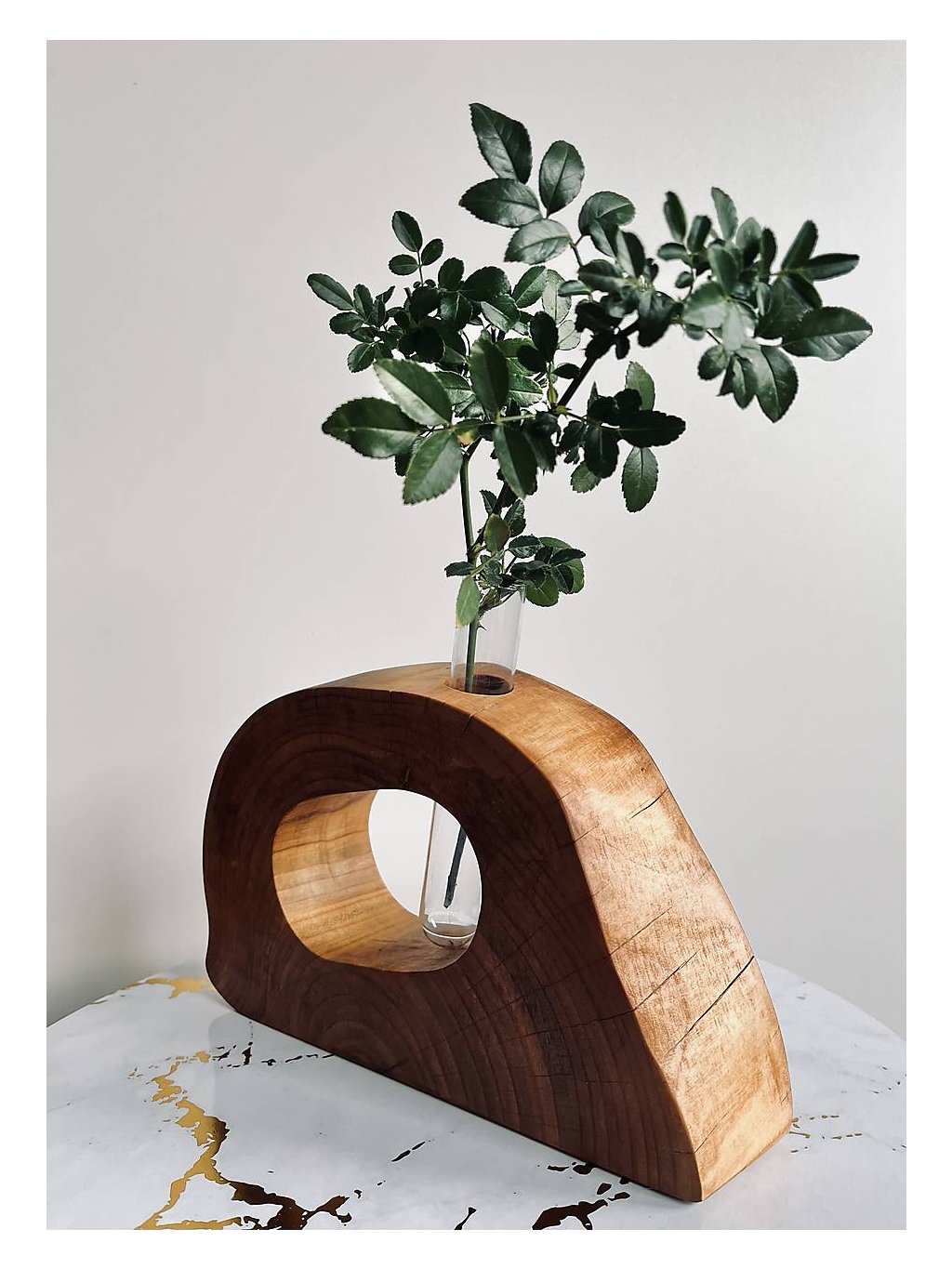 Je to ručne vyrezávaná váza z jedného kusa dreva, čo zaručuje jej vysokú kvalitu a jedinečnosť. Hladké krivky a zaoblené hrany sú doplnené efektným otvorom v strede, ktorý pridáva na jej modernom a umeleckom vzhľade. Nejde len o vázu – je to handmade umelecké dielo a bytový doplnok, ktorý okamžite pritiahne pozornosť.