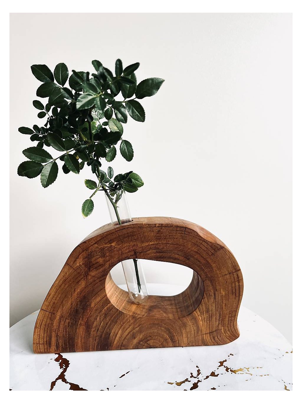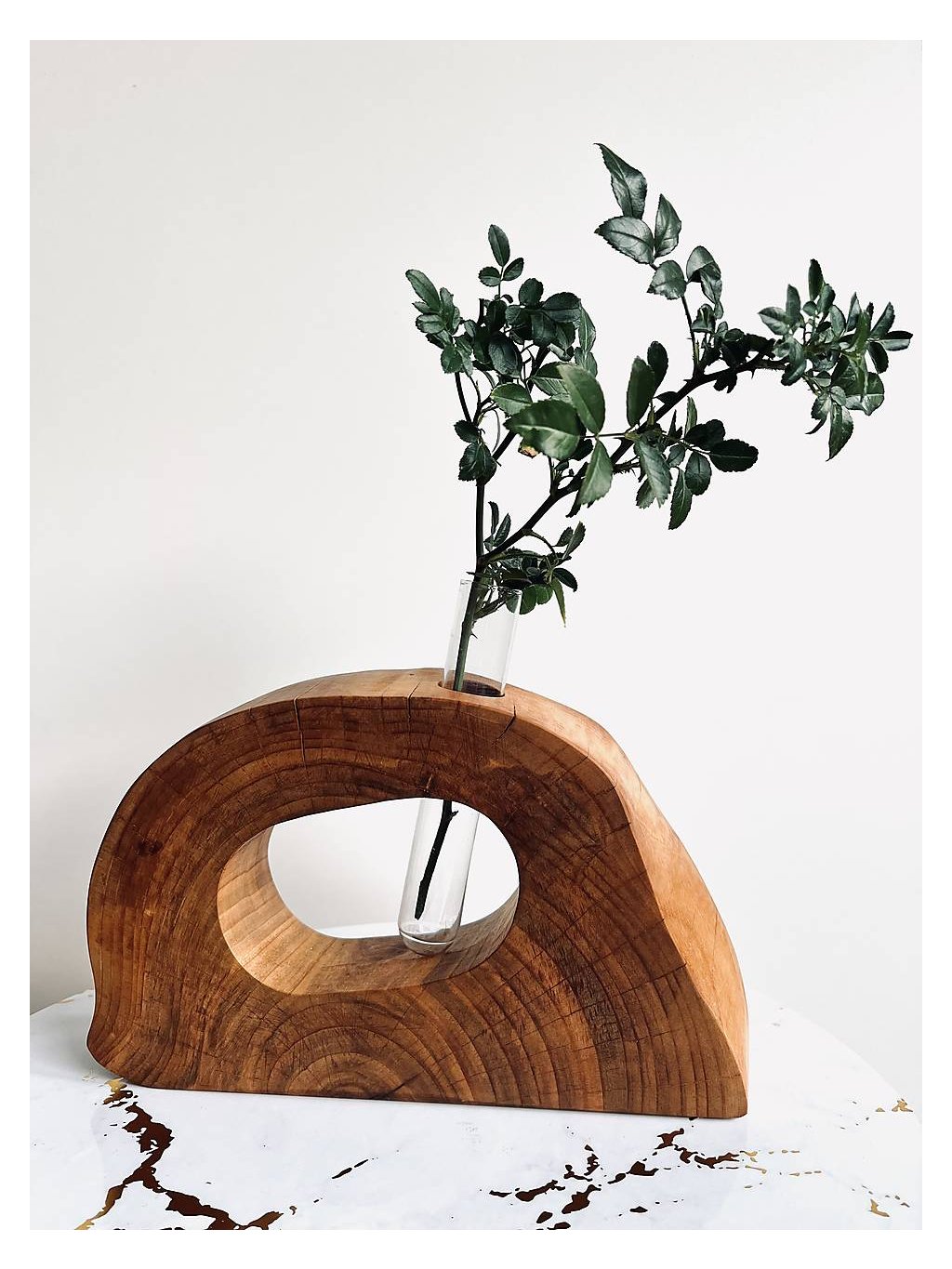 K váze dodávame sklenenú skúmavku, ktorá sa jednoducho vloží do otvoru. Tým pádom môžete túto organickú vázu využiť aj na drobné živé kvety, konáriky alebo na jednoduché aranžmány s vodou bez obáv o poškodenie dreva.