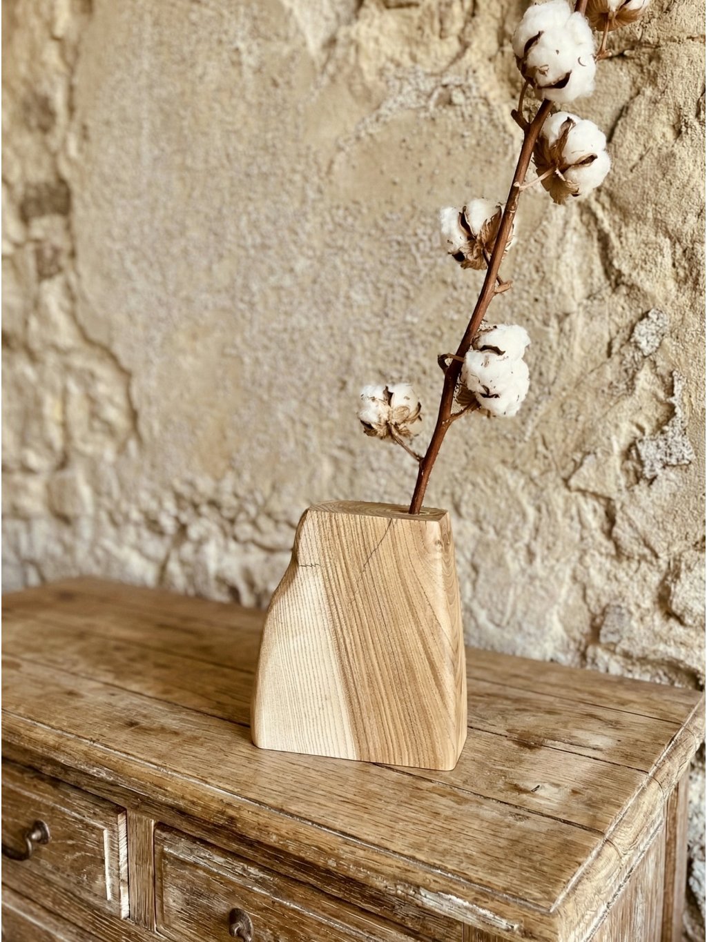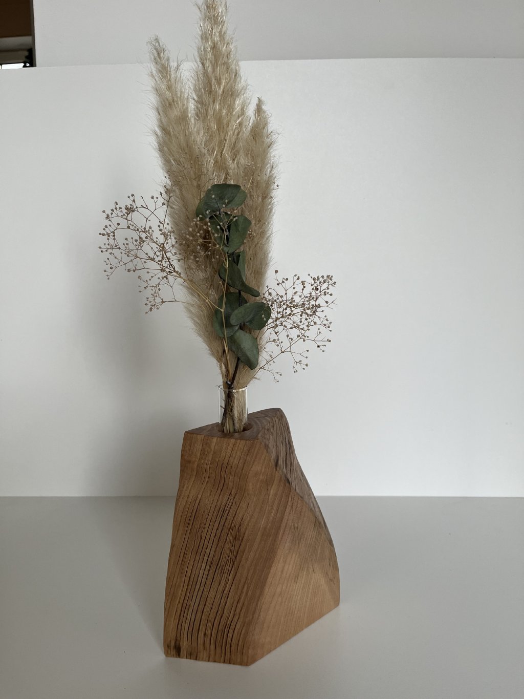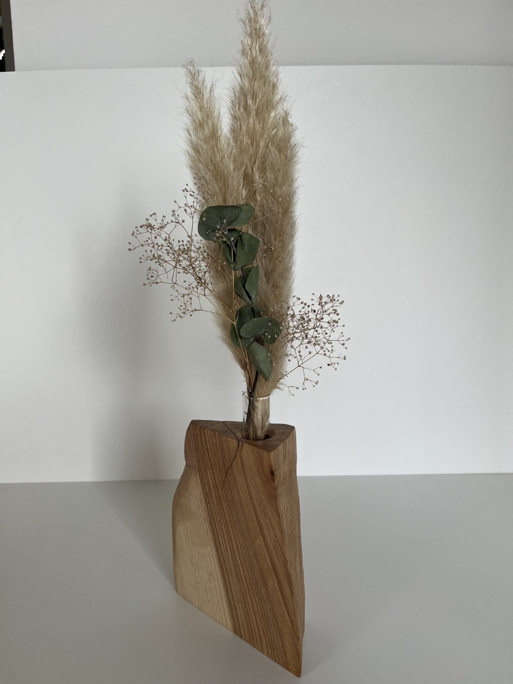 Masívna handmade váza z jaseňového dreva so skúmavkou – ideálna na živé rastliny aj aranžmány