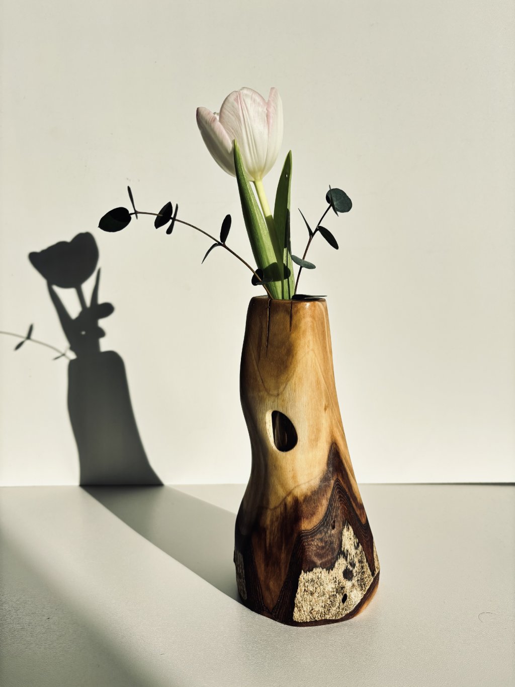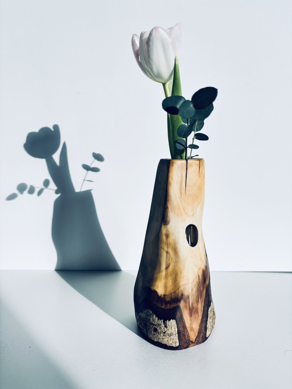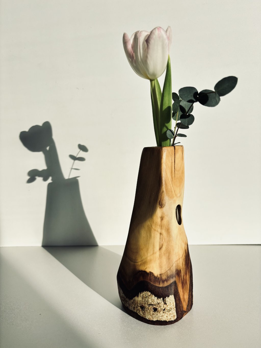 Aby sme nenarušili organický vzhľad masívneho dreva, do vnútra sme zapustili sklenenú skúmavku. Tá je diskrétne schovaná, takže nijako nenarúša čisté línie vázy.