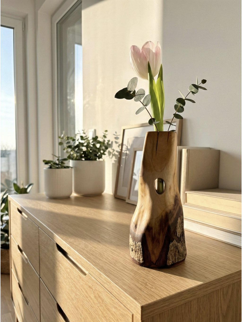- Udržateľný luxus: Ručne vyrobené z orechového masívu, ktorý získal druhú šancu v podobe dizajnového objektu. Toto nie je masová výroba - toto je váza s príbehom.