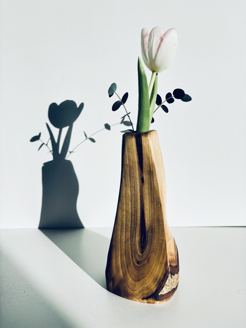 Výnimočnosť tejto vázy spočíva v jej úprimnosti. Priznali sme všetky vrstvy stromu – od drsnej, autentickej kôry na zadnej strane až po detailnú kresbu letokruhov, ktoré odhaľujú vek a silu použitého orecha. Keď ju vezmete do ruky, necítite len váhu dreva, ale doslova hmatateľnú históriu a roky rastu, ktoré predchádzali jej vzniku. Dokonca má na zadnej strane dieru - alebo možno úkryt pre fantáziu a zamyslenie sa? :)