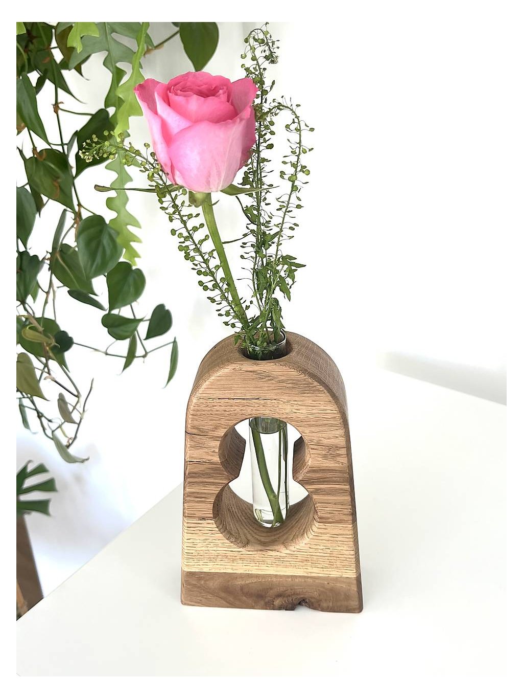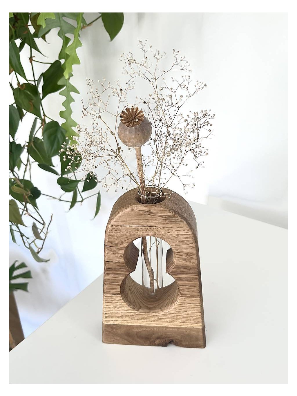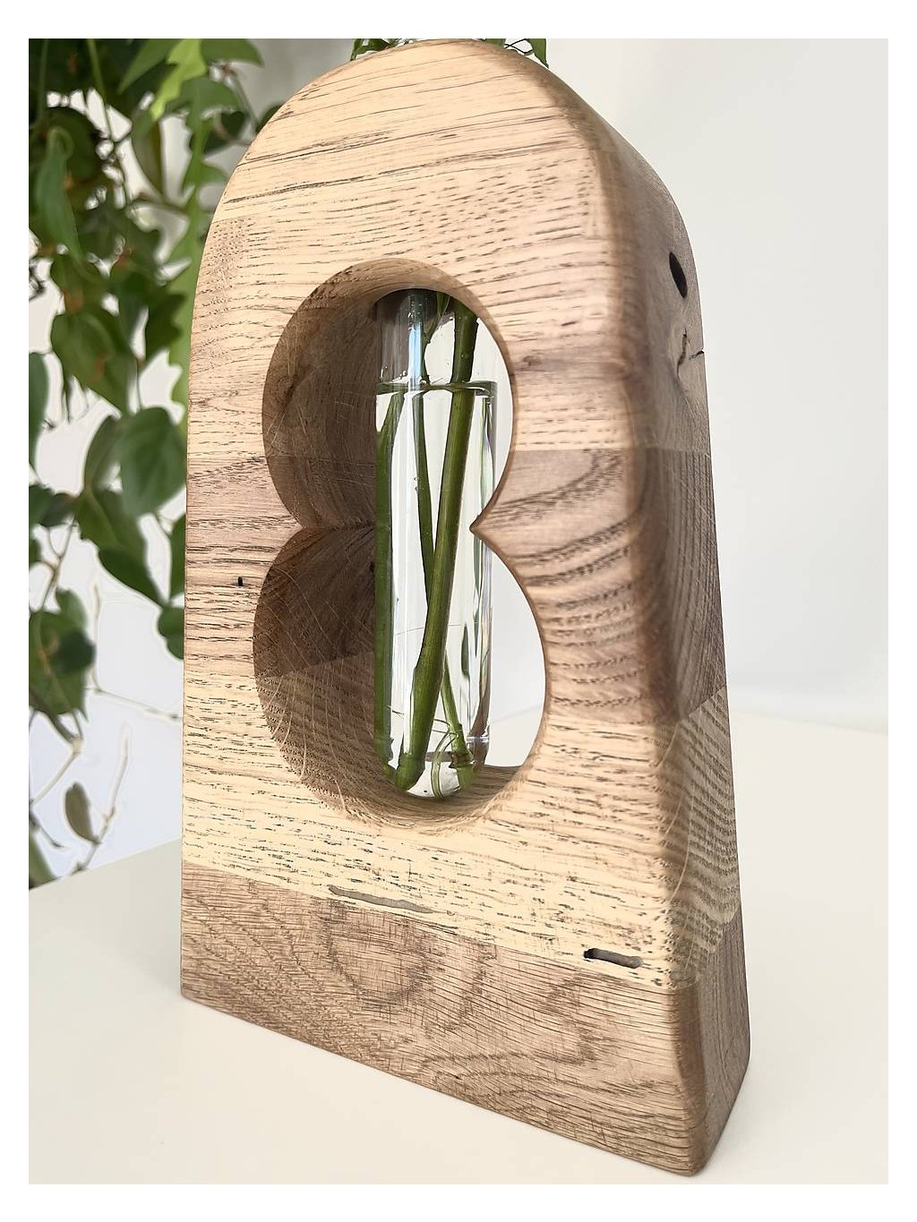Objav krásu prírodného materiálu v minimalistickom dizajne. Táto ručne vyrobená váza z masívneho dubového dreva v sebe spája funkčnosť a estetiku – vďaka sklenenej skúmavke (dĺžka 12 cm) ju môžeš využiť ako štýlový zakoreňovač na rastliny, alebo ako vázu na čerstvé či sušené kvety.