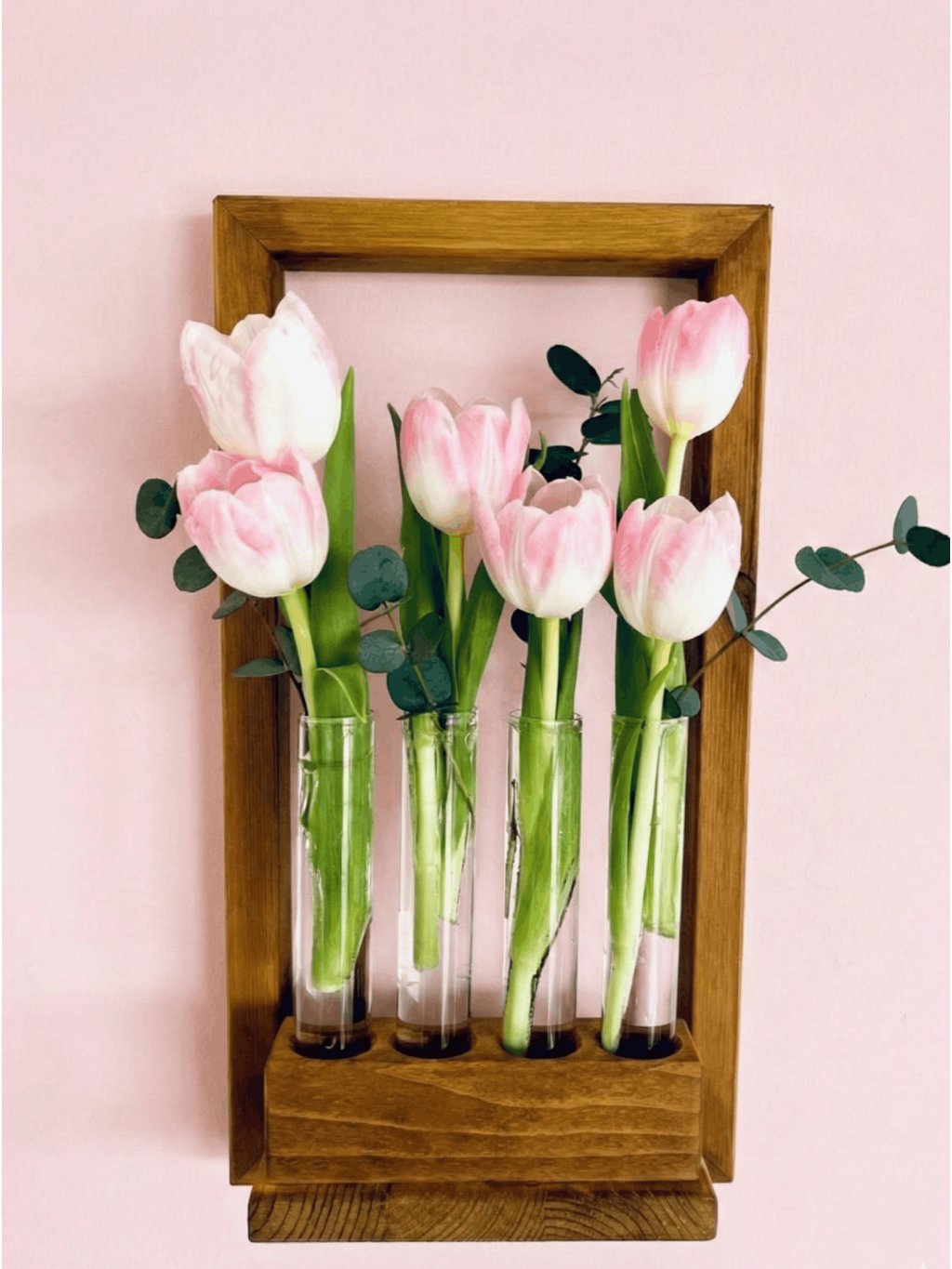 Predstavujeme vám nástenný stojan zo smrekového dreva so 4 skúmavkami, ktorý premení vašu stenu na originálny živý obraz. Nie je to len dekorácia. Je to rám pre vaše spomienky, nálady a príbehy.