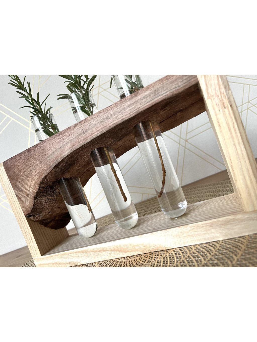 Ručne vyrobený zakoreňovač z jaseňového a orechového dreva – s tromi skúmavkami.