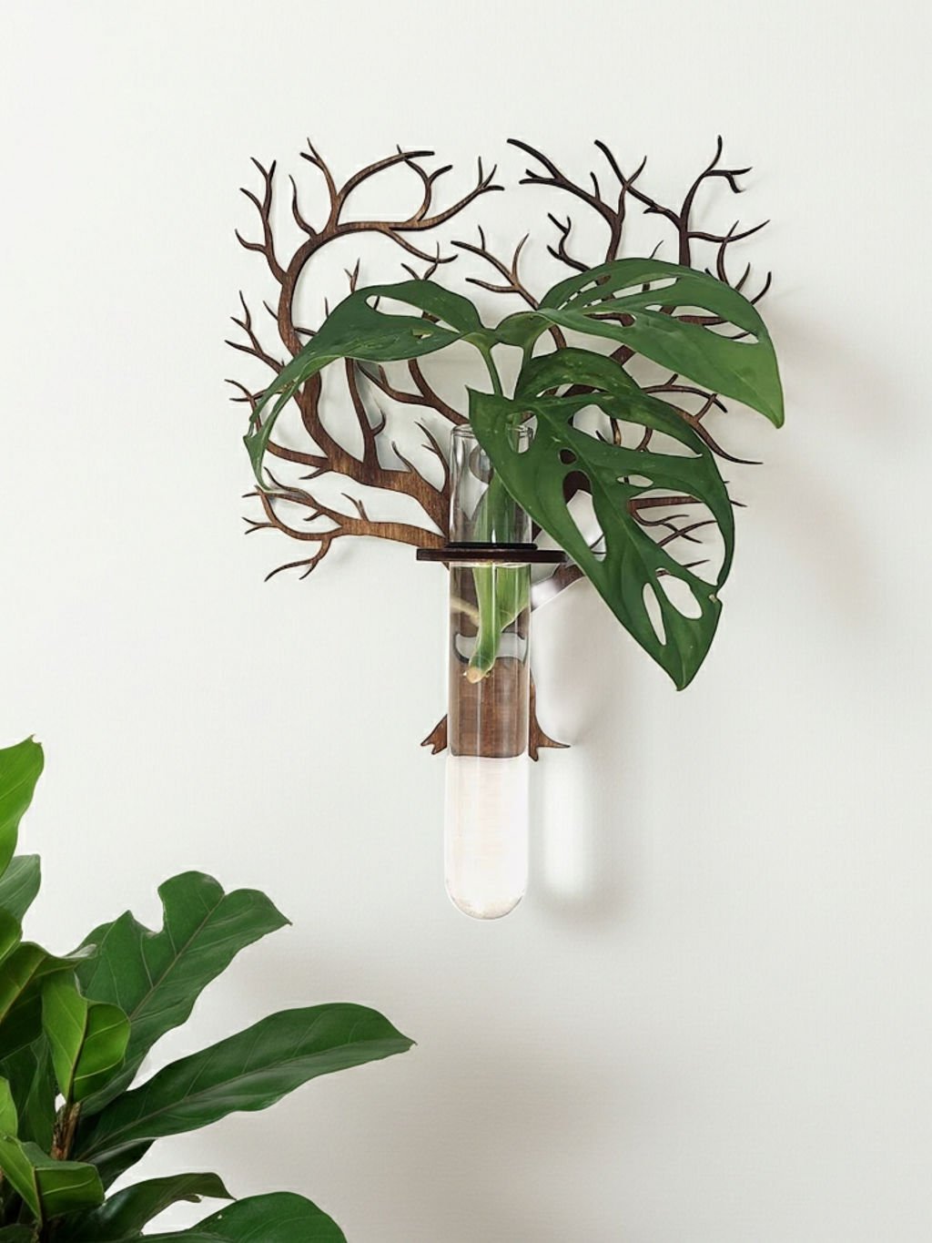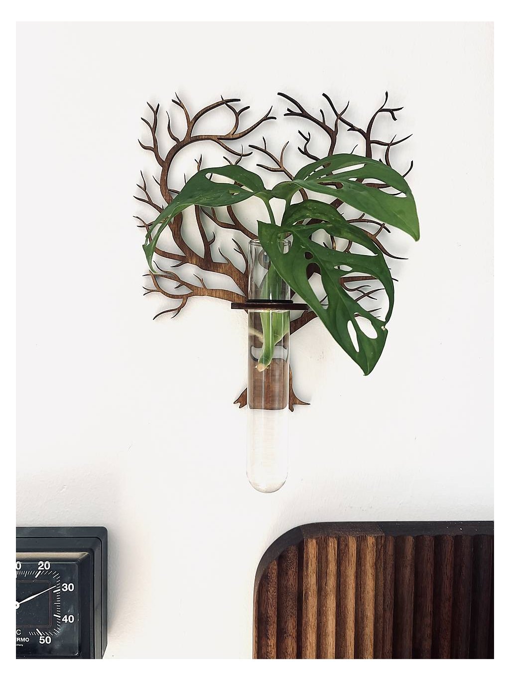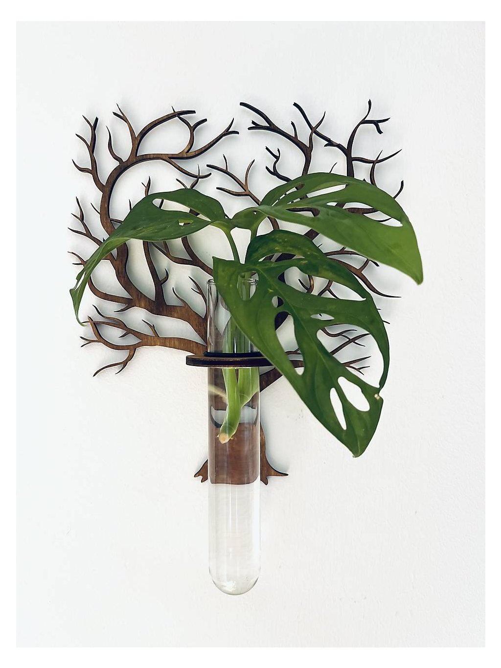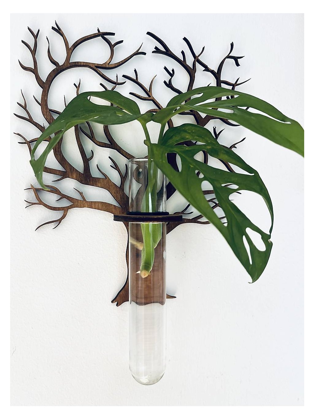 Použitie: Do stojana sa vloží sklenená skúmavka, do ktorej dáte vodu a obľúbenú rastlinu (napr. monstera adansonii, ako na obrázku), ktorú chcete zakoreniť. Skúmavka je dostatočne veľká na to, aby poskytla rastline ideálne podmienky.